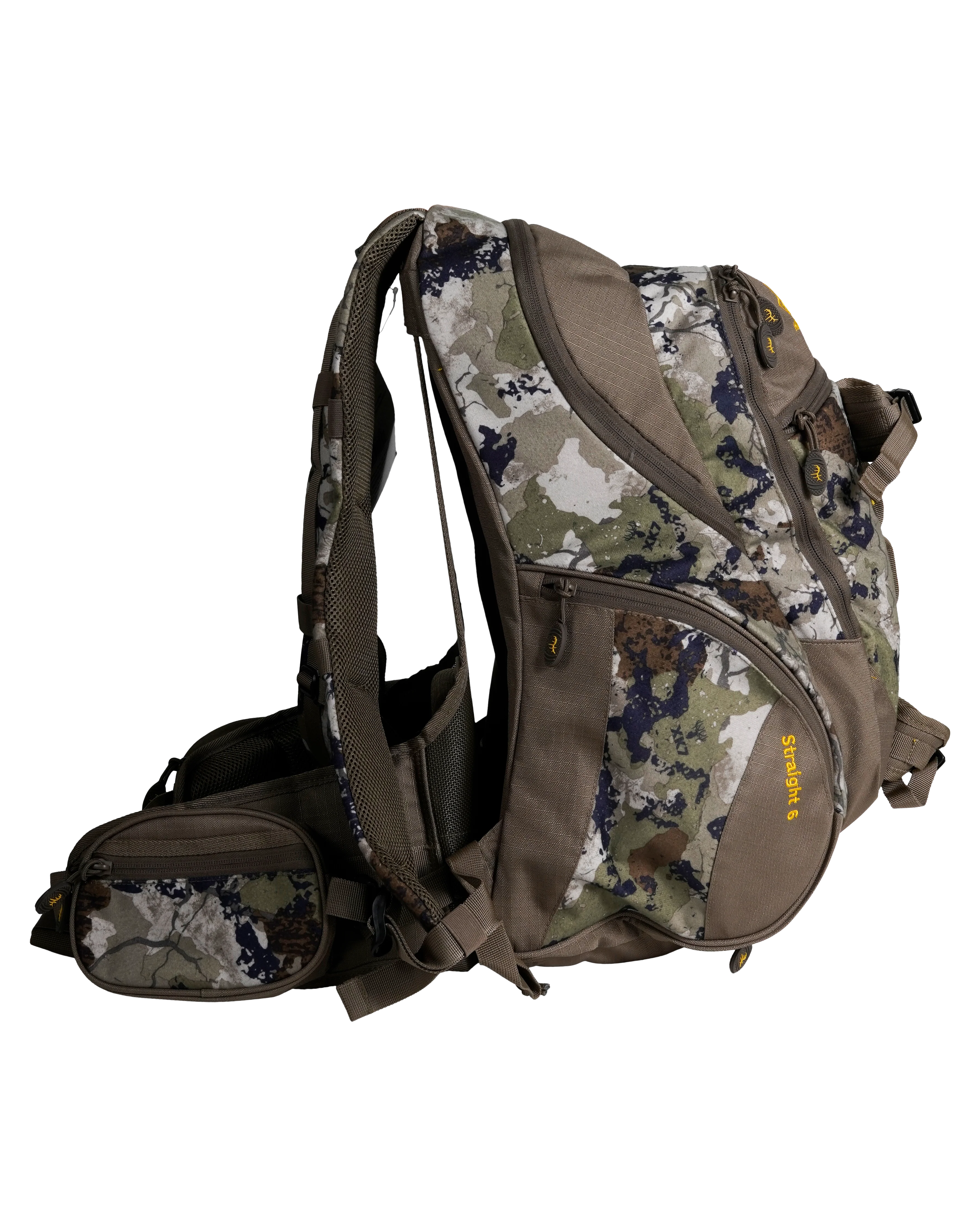 The Straight 6 Daypack includes 1800 cubic inches of storage and convenient pockets for all your gear. Being able to pack tight and light is where the Straight 6 shines. Elastic pockets on the sides allow for easy storage of optics, tripods, and more.