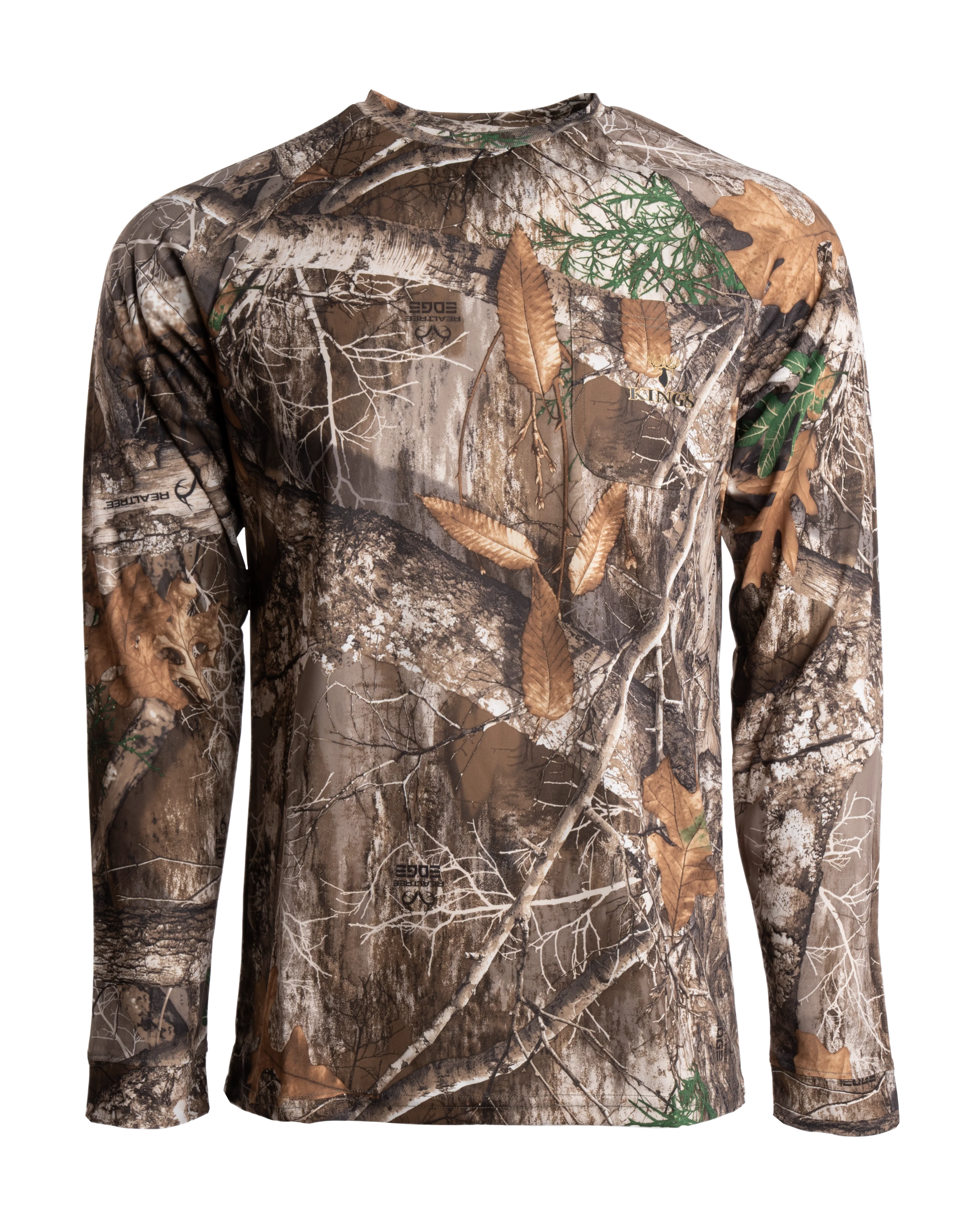 The Hunter Series Long Sleeve Shirt is built for full concealment and protection from sun or cold. A quick-dry, 100% polyester birds-eye mesh fabric enhances its natural wicking properties keeping you dry and comfortable. Includes a large pocket on the left chest. Perfect for early season archery or a base layer shirt.